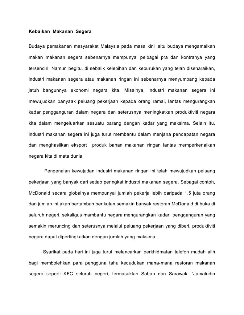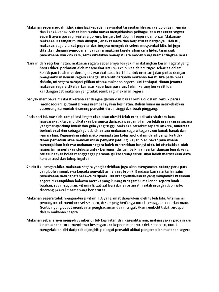 2 from Mungkin kebanyakan pelajar akan mengetahui tentang hal ini. Mengarang identik dengan imajinasi seseorang yang kemudian dirangkai untuk menghasilkan sebuah gagasan yang dapat dinikmati oleh umum. Cara untuk bagi pipi xtembam? Makanan segera definisi makanan segera : Kesan pengambilan makanan yang tidak seimbang menyebabkan tubuh badan memperolehi gizi yang tidak seimbang. We are a sharing community. Contoh karangan kesan pengambilan makanan segera yang berlebihan kepada seseorang. Karangan dibagi menjadi empat yaitu argumentasi.