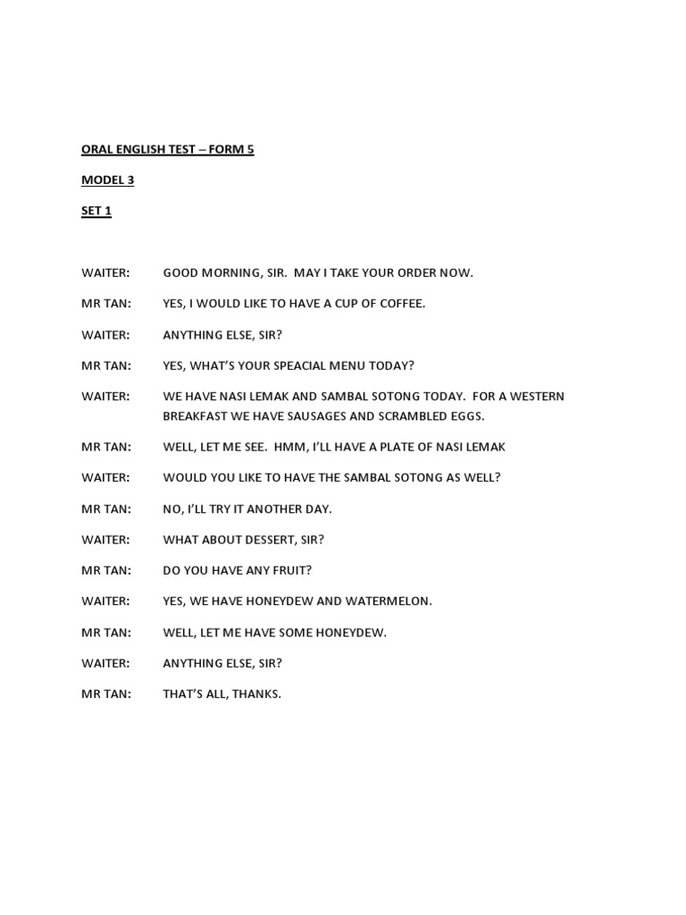 Ulbs sample script for form 5 studentsfull description. Oral language is the system through which we use spoken words to express knowledge, ideas, and feelings. Graduate students are exempt from demonstrating oral english proficiency if. English oral test example spm cooking food wine. However, the spm paper also tested on poetry comprehension and critical response to. English for critical academic reading (elc501). Introduction it is acknowledged that chinese students start to learn english from the early year of primary school. Dialogue oral on handphone topic communication technology. Find out more about this essential psle english oral course here. If you keep a safe distance from english conversation or stay away before you step into the reality and advance your oral communication skills, it is quite essential to understand the basics of communication skills. A reader asked how to score an a in spm bahasa melayu at malaysia students forum. English oral forum script.in fact, english is the official second language in malaysia. Those who don't pass bahasa melayu will sit for spm july paper (spm kertas julai) the year after they have had their sijil pelajaran malaysia (spm) examination.