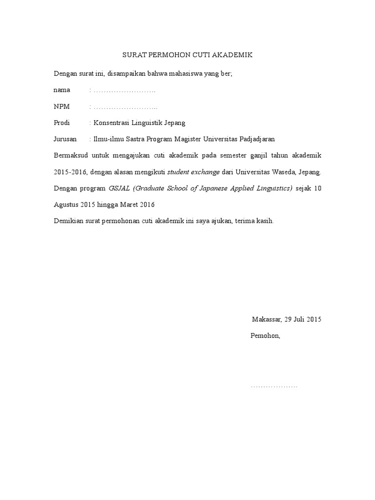 Ada banyak hal yang bisa menyebabkan hal tersebut terjadi, seperti karena mahasiswa tersebut mengalami. Contoh surat permohonan cuti kuliah. Contoh surat permohonan cuti bagi anda yang berprofesi sebagai pegawai negeri sipil (pns). Namun, bukan berarti perusahaan tidak memberikan cuti atau waktu libur , jika memang karyawannya memiliki suatu. Surat izin cuti menikah juga tergolong surat resmi, maka anda harus membutanya dengan baik dan benar sebelum mengajukannya. Jika anda belum paham terkait format penulisan, atau anda butuh contoh surat cuti yang bisa dijadikan refrensi, baca saja artikel singkat. Demikian surat izin cuti ini dibuat untuk dipergunakan sebagaimana mestinya. Kementerian agama kantor wilayah propinsi lampung jl. Contoh surat cuti karyawan untuk alasan tertentu. Baik itu untuk para karyawan di perusahaan swasta, perusahaan bumn, dan juga pegawai negeri. Sebaiknya anda memilih terlebih dahulu untuk cuti sementara. Dengan surat ini saya bermaksud untuk mengajukan cuti kerja selama 3 hari kerja karena orang tua yang sedang sakit. Kita sebagai mahluk tuhan yang notabennya mahluk sosial mempunyai rasa dan hati sehingga suatu ikatan cinta yang berujung pada pernikahan sangatlah dibutuhkan.